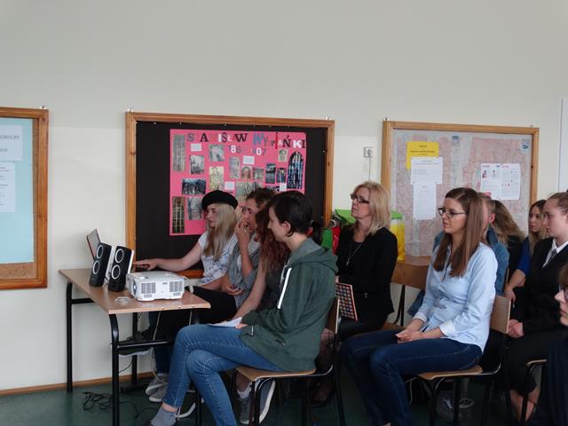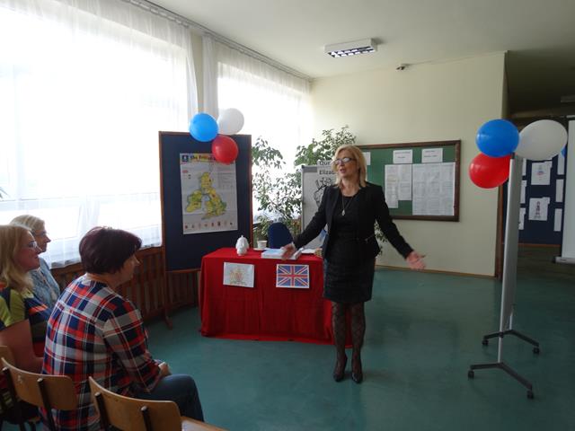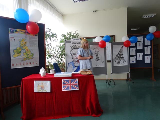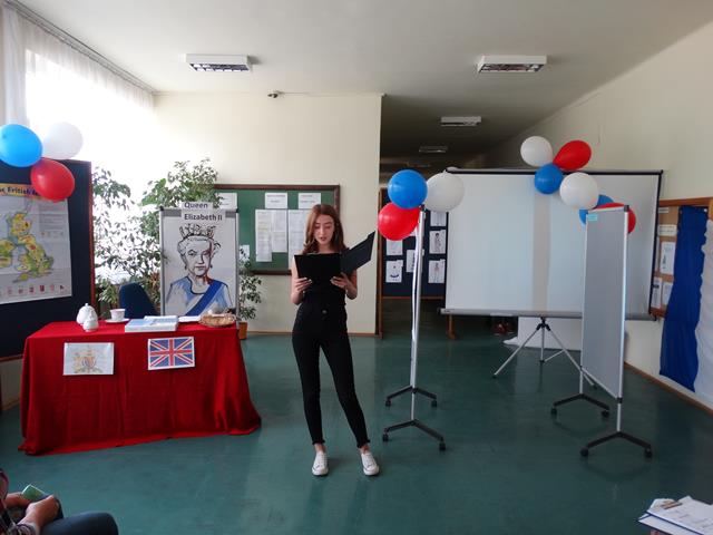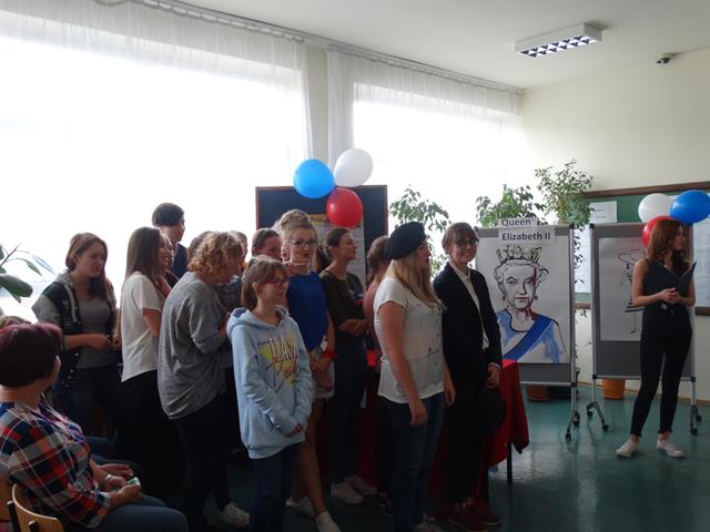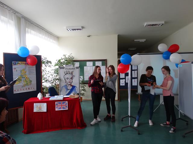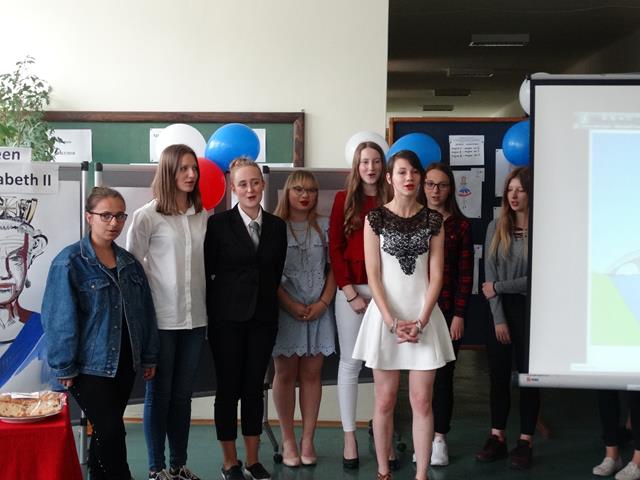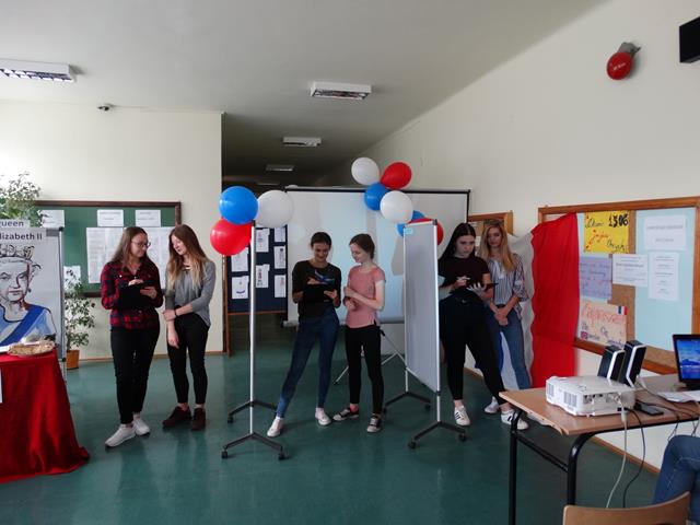 Angielską część spotkania rozpoczęto od prezentacji wykonanej przez uczennicę klasy IIL Anię Joniec, która przybliżyła nam podstawowe informacje o Wielkiej Brytanii oraz brytyjskiej rodzinie królewskiej. Po prezentacji zgromadzeni mieli okazję obejrzeć skecz pt. „Rodzina królewska”, który zaprezentowały uczennice z klasy IL oraz IIL. Uczennice wcieliły się w role głównych członków brytyjskiej rodziny królewskiej, tj. królowej Elżbiety II, księcia Williama, księcia Karola, księcia Harry’ego oraz jego żony. Przedstawiona scena miała charakter satyryczny i rozbawiła zgromadzoną publiczność. Kolejnym punktem programu był quiz. Reprezentanci klas odpowiadali na pytania związane z rodziną królewska. Zwyciężyła drużyna reprezentująca klasę IIIL.