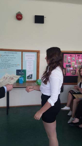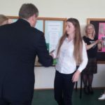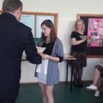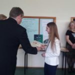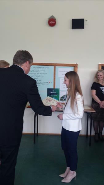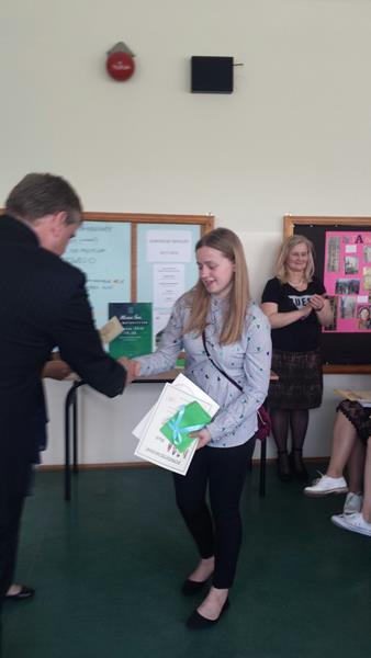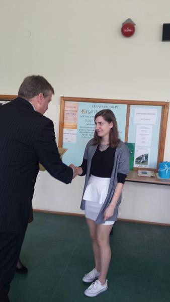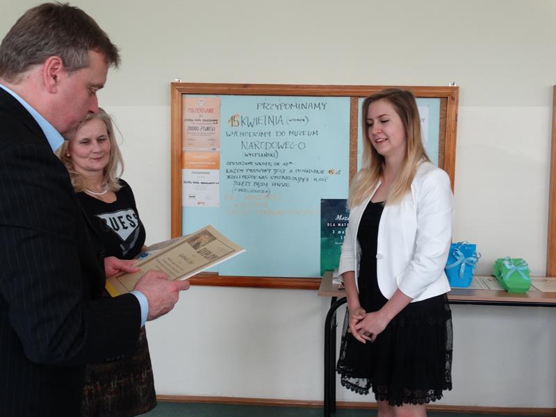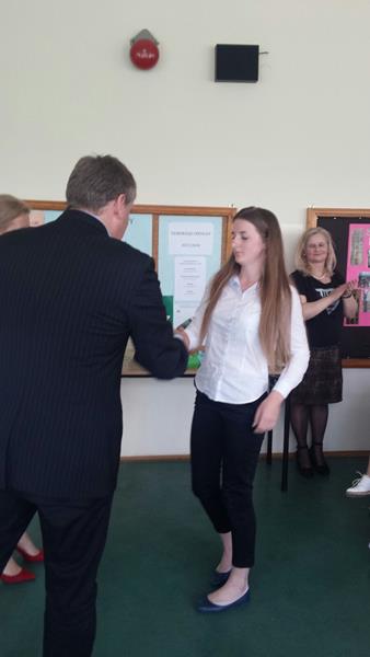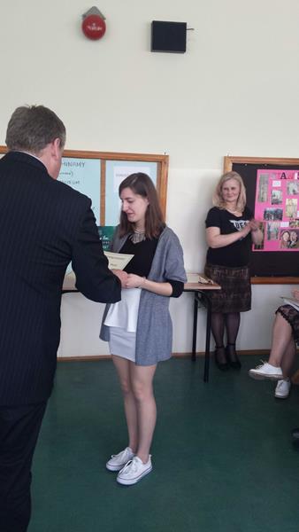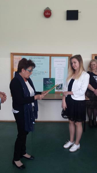 Dziękując uczennicom za osiągnięcie wysokich wyników w nauce, pracę w Samorządzie Szkolnym, Banku Żywności, udziału w pokazach mody, organizacji uroczystości szkolnych, Pan Dyrektor wraz z wychowawcą Panią Dorotą Jaracz wręczył młodzieży dyplomy i upominki przygotowane przez nauczycieli.