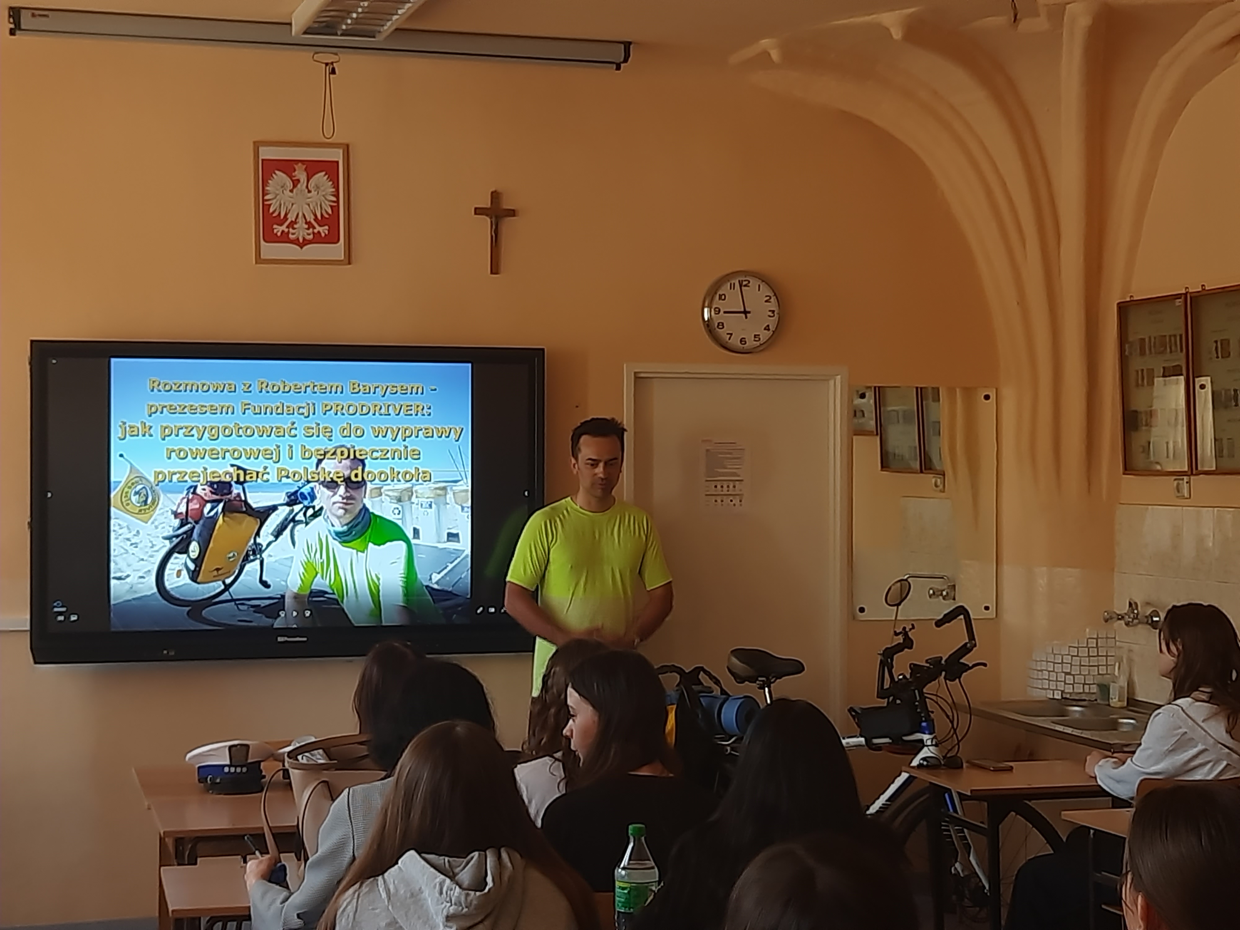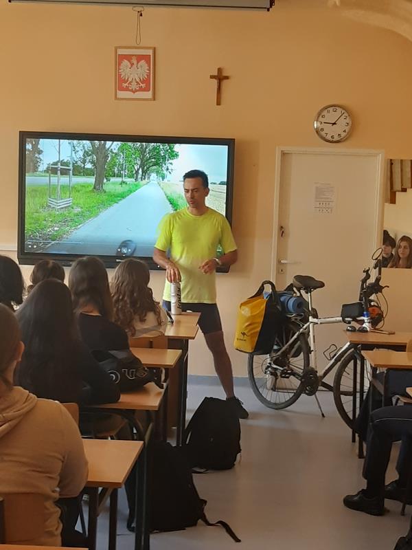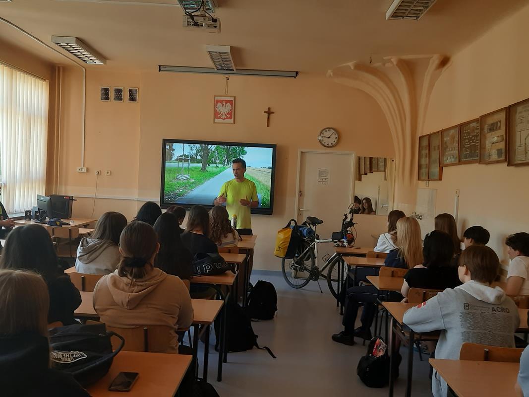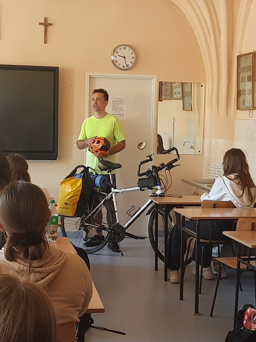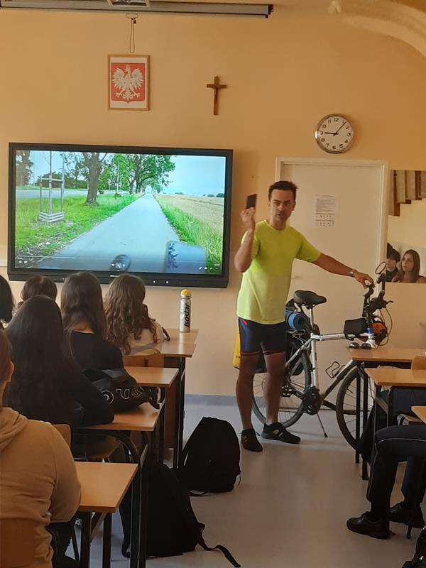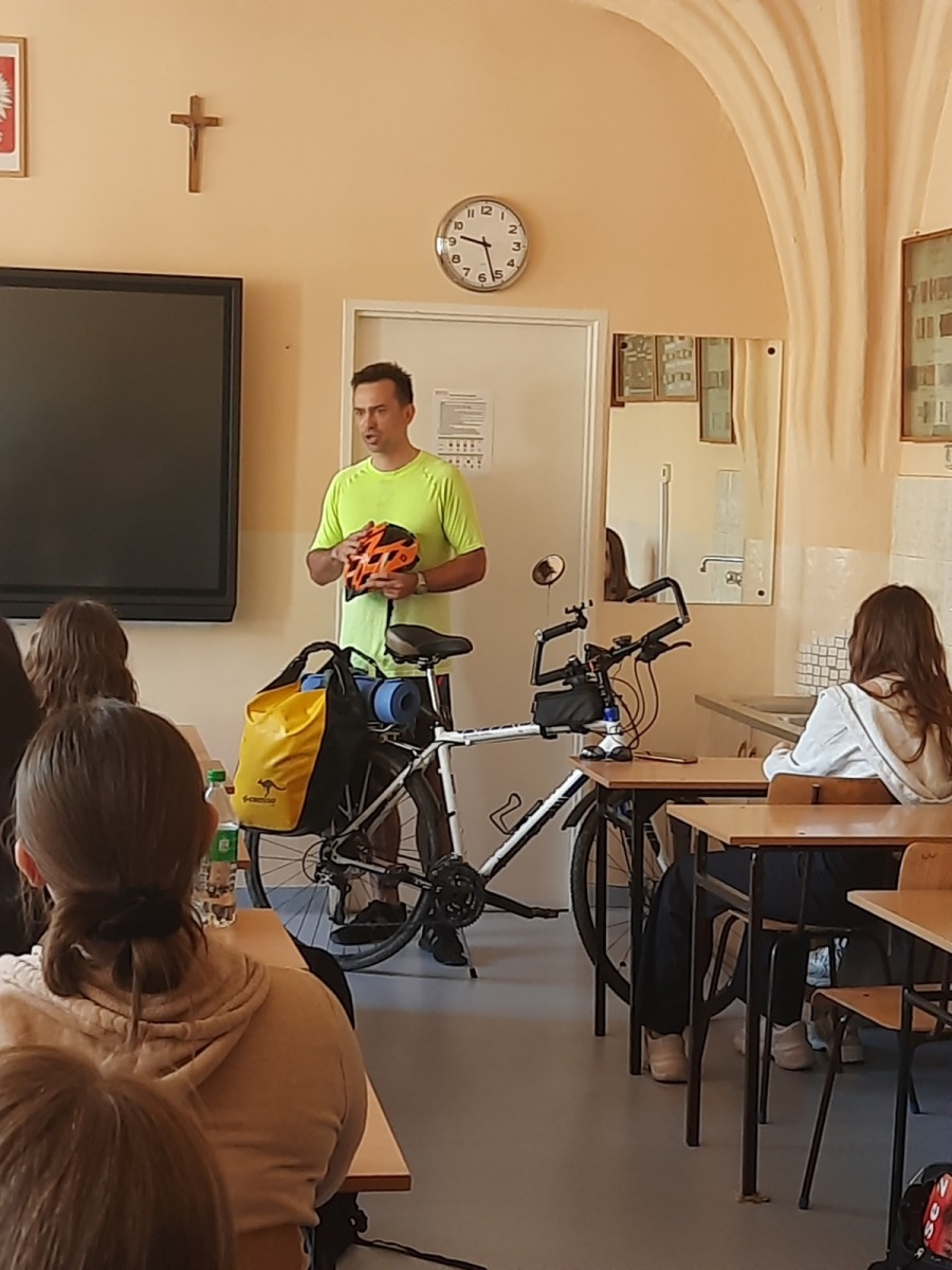 W dniu 23 maja nasza szkoła gościła Pana Roberta Barysa, który samotnie w 5 dni chce przejechać Polskę z Zakopanego do Gdańska (750km). Podczas swojego przejazdu spotyka się z młodzieżą z wybranych miast, jakie będzie mijał na trasie przejazdu, aby uczyć na swoim przykładzie bezpiecznej jazdy rowerem i hulajnogą i tłumaczyć młodym ludziom jak przygotować się do takiej wyprawy.