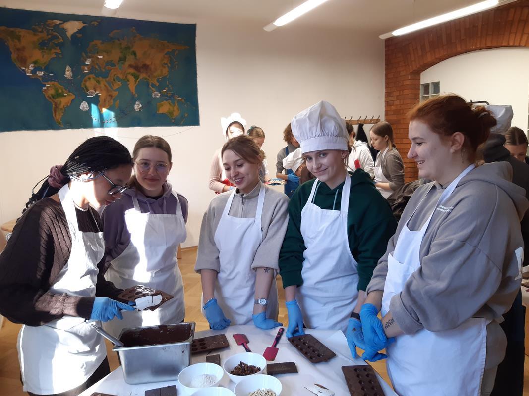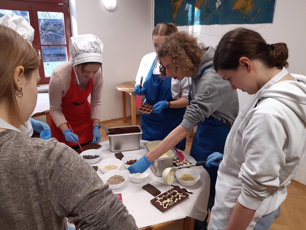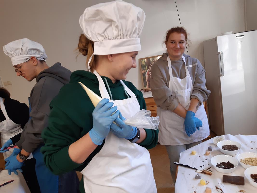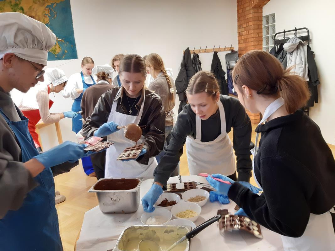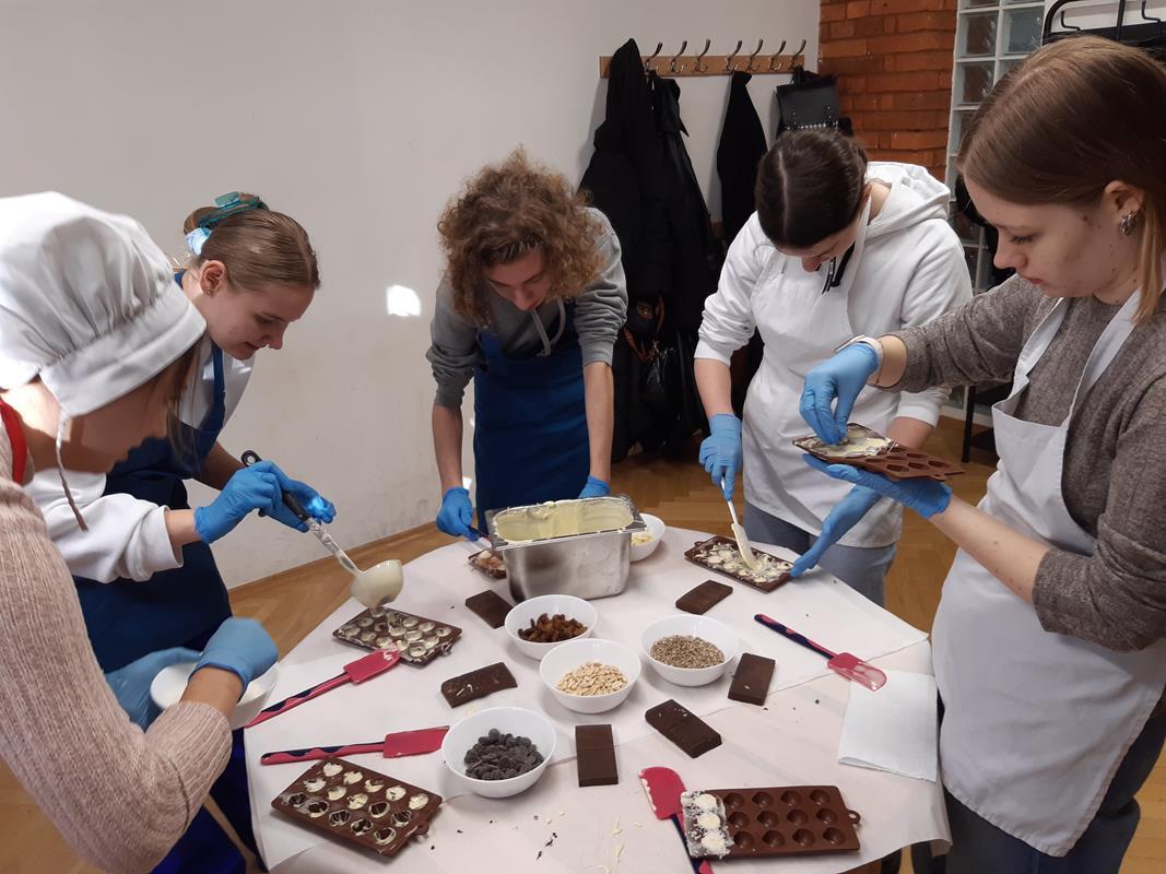 Pierwszym punktem naszej wycieczki były warsztaty w Krakowskiej Manufakturze Czekolady. Podczas zajęć poznaliśmy historie powstawania głównego surowca czyli kakaowca, produkcję czekolady oraz wykonaliśmy własnoręcznie czekoladowe przysmaki. Spędzony tam czas upłynął nam szybko i w miłej atmosferze. Wykorzystując ładną pogodę przeszliśmy spacerem do Muzeum Narodowego.