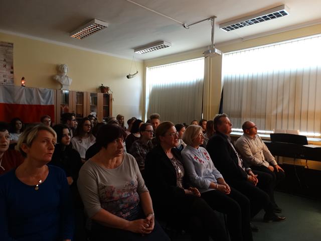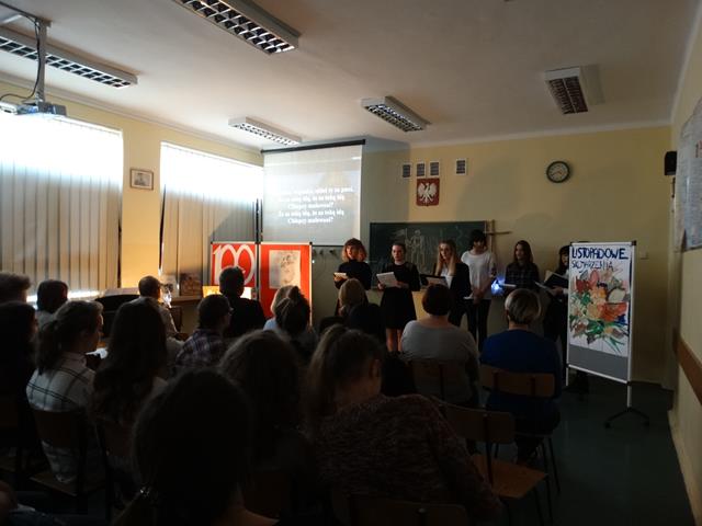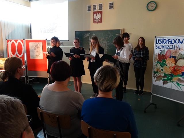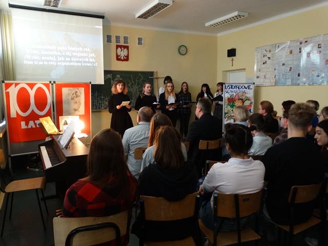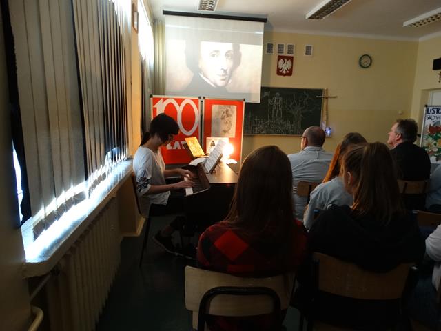 Poezja patriotyczna – Fragmenty „ Myśli nowoczesnego Polaka” Romana Dmowskiego. Uczennica klasy III L Ania Joniec zagrała walca i poloneza F. Chopina. Wspólnie odśpiewaliśmy znane pieśni patriotyczno- legionowe: „Rozkwitały pąki białych róż”, „ Wojenko, wojenko…”, „ O mój rozmarynie rozwijaj się”, oraz „Rotę”.