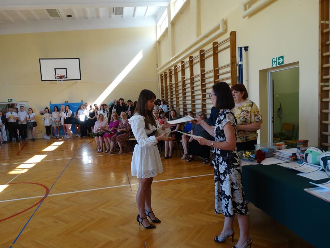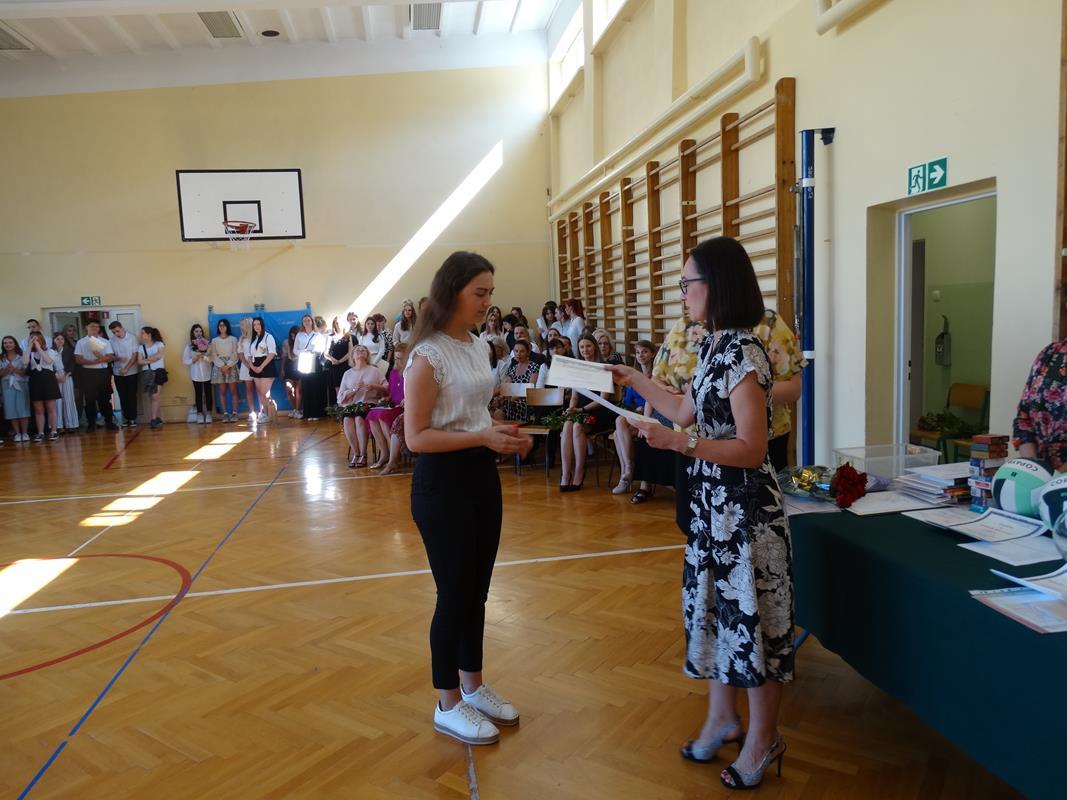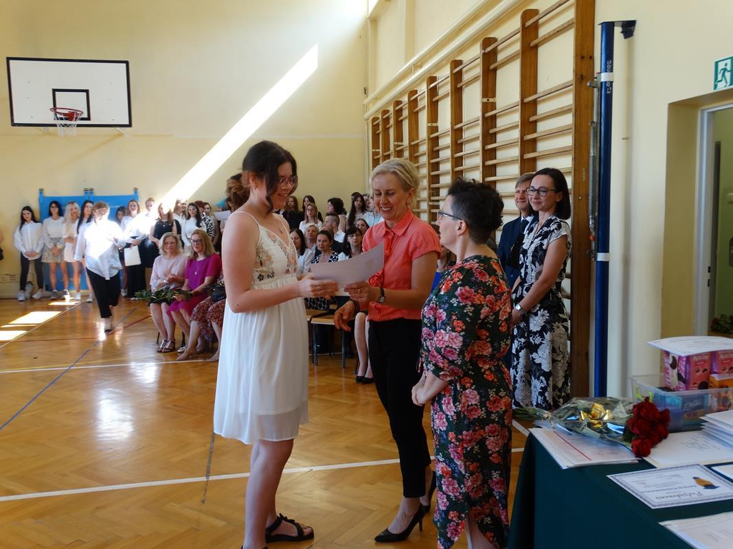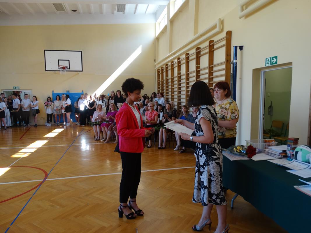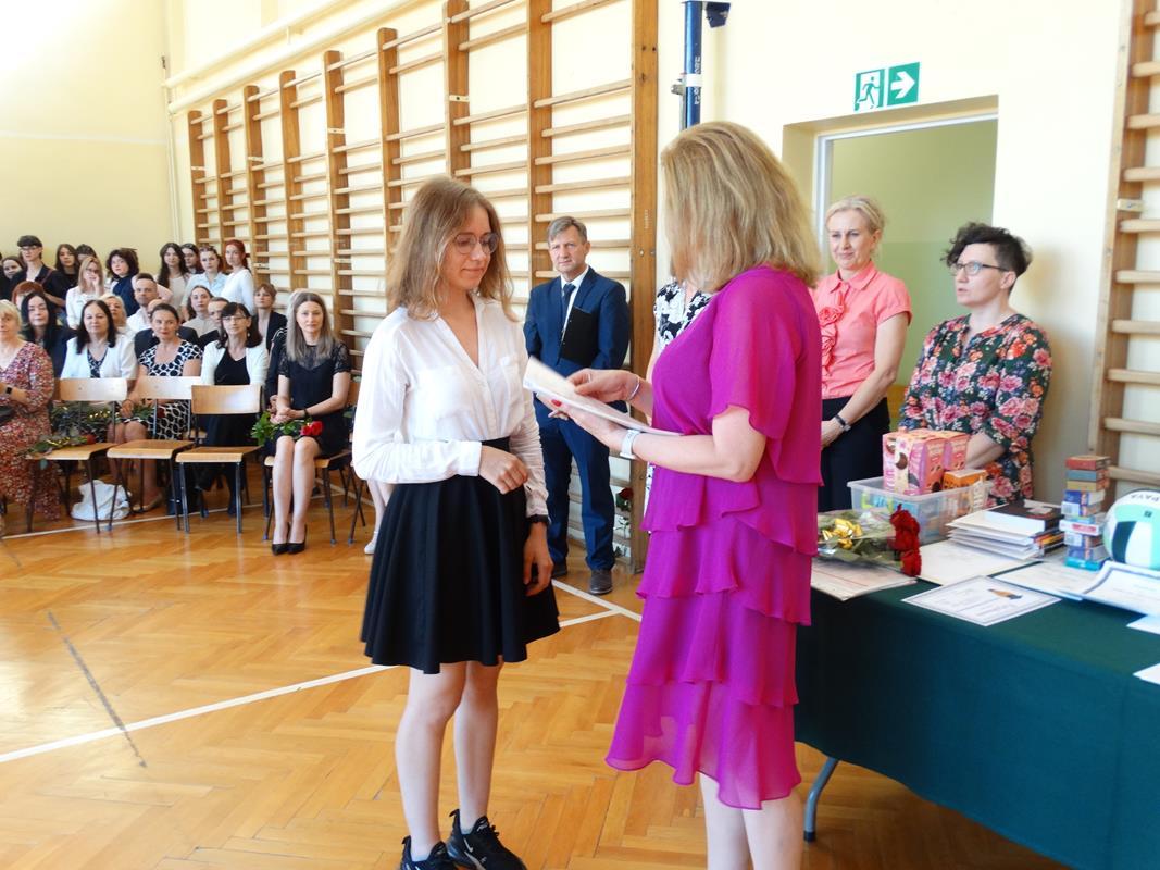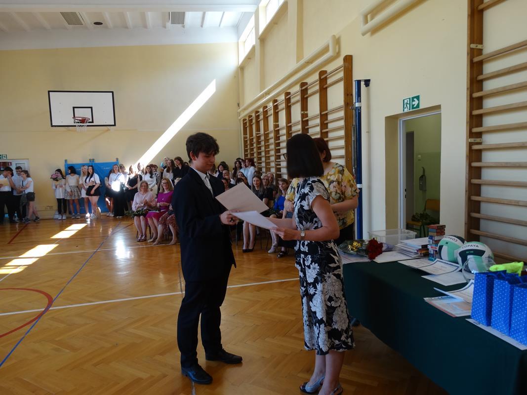 Pani Dyrektor mgr Dorota Potoczny podziękowała młodzieży za bardzo dobre wyniki w nauce, wzorowe zachowanie, udział w olimpiadach, konkursach, pokazach, pracy na rzecz szkoły. Wyróżnieni otrzymali dyplomy oraz upominki. Samorząd Uczniowski w imieniu wszystkich uczniów na ręce Pani Dyrektor złożył podziękowania za miniony rok szkolny.